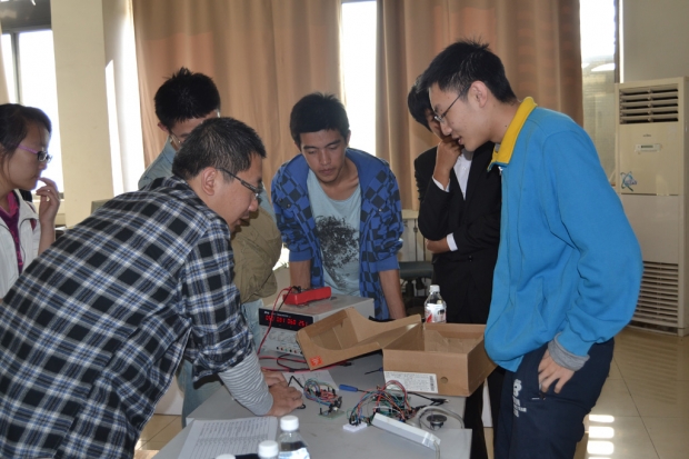 此次答辯過程由老師提問作評和優秀學長審核兩個環節組成。在第一個環節,鄧軍老師、袁曉光老師和李隱峰老師對每一件參賽作品都作了認真的點評,并給予參賽同學改進的建議。參賽同學紛紛表示通過與老師的交流,認識到自己作品的不足,同時也得到了老師們專業的建議,拓寬了自己的視野。在第二個環節中,參賽同學不僅收獲了很多關于電子產品制作的寶貴經驗,還博得了優秀學長們關于星火杯作品質量逐年提高的稱贊。