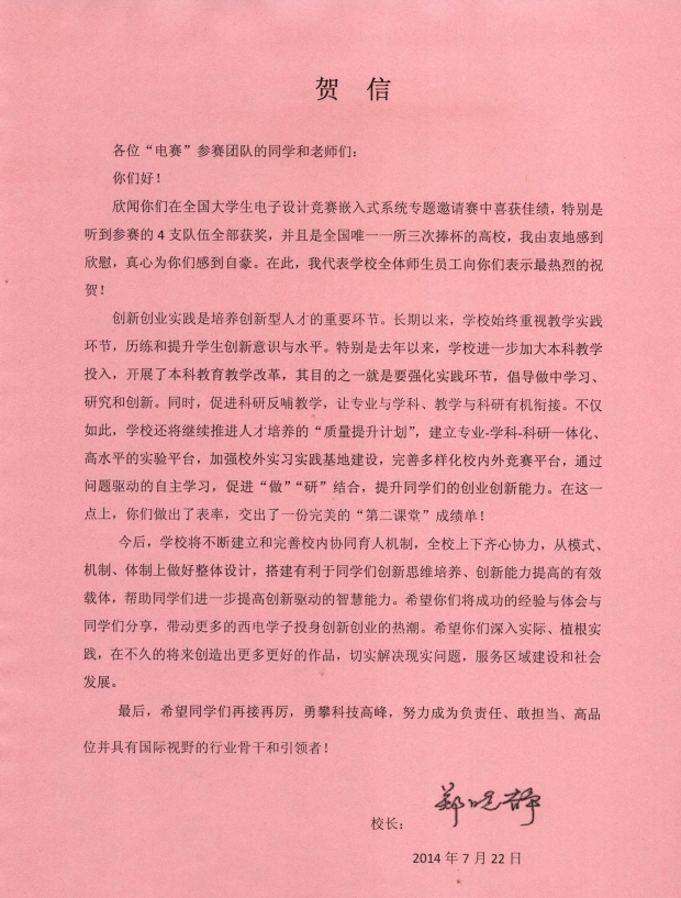 學校其他三支代表隊也取得了優異的成績,由付少鋒、趙建任指導教師,李宏愿、孫春宇、張旭同學為參賽隊員的參賽隊作品“太極教練”獲全國二等獎;由任愛 鋒、王偉任指導教師,朱逢豪、劉川、王云中同學為參賽隊員的參賽作品“基于腦電波的注意力訓練系統”獲全國二等獎;由楊剛、蔡覺平任指導教師,王柏林、王 明紀、郗雪潔同學為參賽隊員的參賽作品 “基于可見光通信的智能交通信息發布系統”獲全國三等獎。