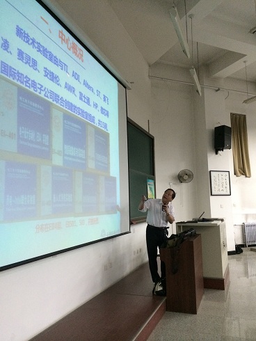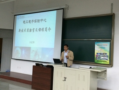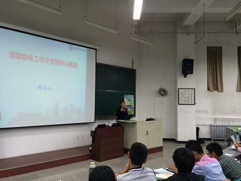 國家級電工電子實驗中心副主任周佳社介紹了實驗中心的概況以及中心成立以來取得的國際及國內競賽成績,也介紹了中心開展大學生自主創新實驗、課外科技活動取得的成效等。中心創造的成績讓同學們興奮不已,周老師的講解不時被陣陣熱烈的掌聲所打斷。熱烈的掌聲,連接著師生們薪火相傳的決心,激發了同學們參與到課內外科技實踐中的激情。中心EDA實驗室任愛峰老師代表全體新技術實驗室老師詳細介紹了各新技術實驗室面向全校本科生所開設的課程及課程性質,目的在于便于同學們發揮自身特長與愛好,有選擇性地進行課程選修與科技創新,從而培養學生的綜合設計與創新能力。最后,由全國大學生電子設計競賽培訓老師王新懷詳細介紹了全國大學生電子設計競賽的流程,前期準備以及如何選拔競賽選手等內容。同學們摩拳擦掌,亟不可待。