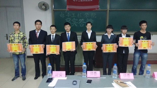 9月21日晚18:30始,由電子工程學院團委主辦的電子工程學院暑期社會實踐答辯活動于南校區B樓206展開,電子工程學院團委組織部部長劉侍鑫、外聯部部長韓雪、素拓部部長劉光遠,機電工程學院團委副書記蔣國楓,軟件工程學院團委副書記沈瑜悅以及校團委代表衛澤明、李江濤擔任本次答辯的評委。