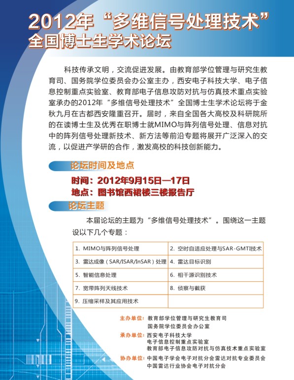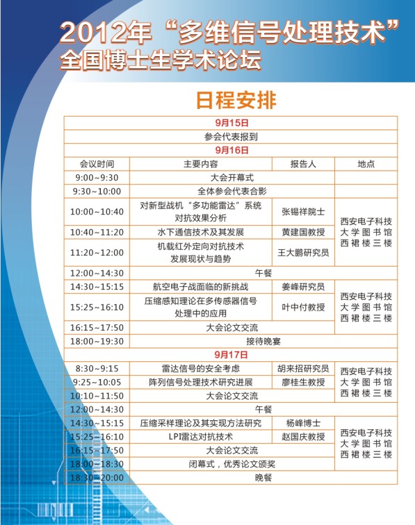 2012年多維信號博士論壇 2012-09-15 09:56:00 瀏覽次數: 上一篇文章:電院組織募捐愛心救助白血病患者吳昌浩同學 下一篇文章:電院學生獲全國大學生電子設計競賽2012年模擬電子系統專題邀請賽一等獎