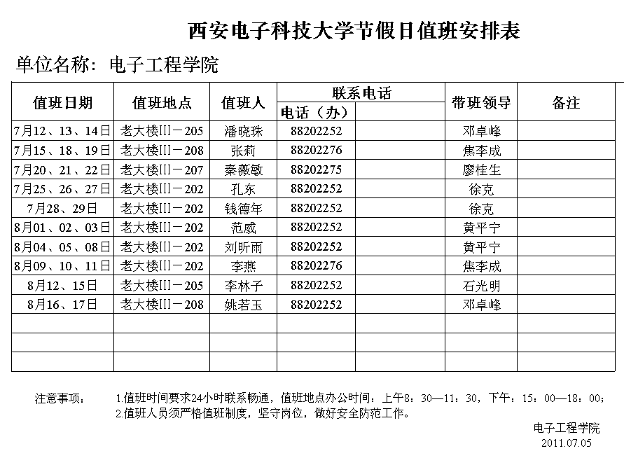 電子工程學院2011暑假值班表 2011-07-12 11:46:00 瀏覽次數: 上一篇文章:智能感知與圖像理解教育部重點實驗室順利通過教育部驗收 下一篇文章:計劃財務處關于2011年暑假值班安排的通知