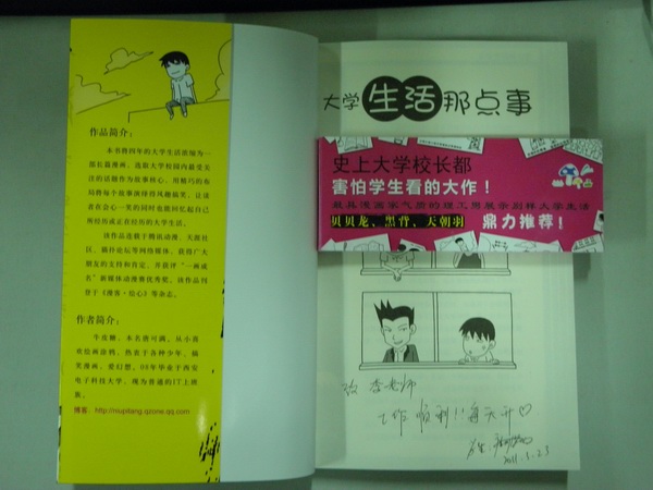 電院校友唐可滿(牛皮糖)返校舉辦個人漫畫《大學生活那點事》首發式 2011-03-24 01:58:00 瀏覽次數: 《大學生活那點事》(原名:紀念我的大學)24號中午12點新校區正式首發 時間:2011年3月24號(周四)中午12點 地點:西安電子科技大學南校區老綜合樓交行對面新區書店 電院020411班畢業生 唐可滿 唐可滿:用漫畫《紀念我的大學》 相關報道http://comic.people.com.cn/GB/124084/11311450.html 最初的書稿 《大學生活那點事》封面 唐可滿 簽名贈送給 電院網絡中心 更多信息 請訪問 牛皮糖 博客http://niupitang.qzone.qq.com/ 上一篇文章:我院“電磁場與無線技術”獲批高校特色專業建設點 下一篇文章:關于開展西安電子科技大學世園會志愿者選拔、培訓工作的通知
