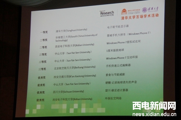 西電新聞網訊(通訊員 竇金娣)2011微軟精英大挑戰“科技點亮綠色生活”創意及展示大賽日前在清華大學圓滿結束。西電微軟技術俱樂部在此次大賽中取得佳績,由李斌、汪文芳等五名同學組成的Phoenix團隊獲全國二等獎,由邵志超、陳建平等四名同學組建的Templar團隊獲全國優秀獎,另外三支參賽團隊獲優秀創意獎。微軟首席研究及戰略官Craig Mundie出席頒獎活動并給獲獎團隊頒獎。