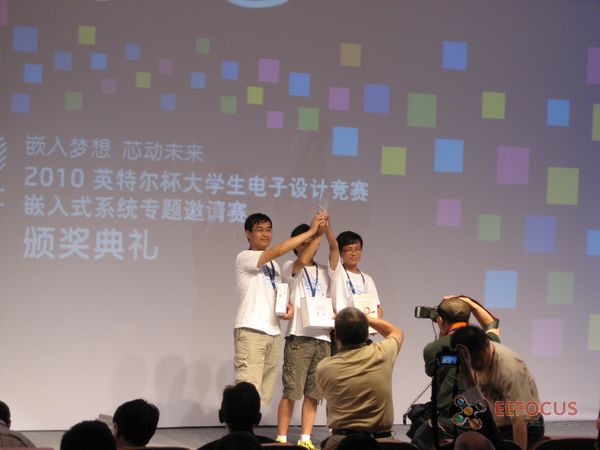 2010年英特爾杯嵌入式邀請賽英特爾杯獲獎團隊----來自西安電子科技大學的“皮影藝術,凌動舞臺”項目團隊,從左到有分別是王浩然,劉鑫以及朱蔭