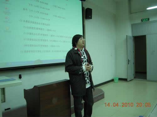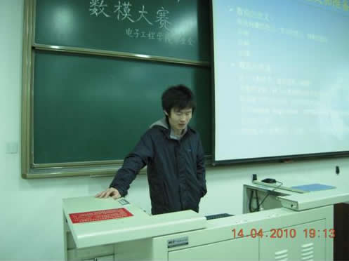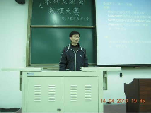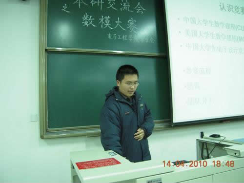 第一個發表演講的是大四學生張學攀,他在數模競賽和電子設計大賽中都取得過優異的成績,主要是對中國大學生數學建模和美國大學生數學建模競賽進行了系統的介紹,使同學們從思想層次上了解數模競賽所考察的方面。