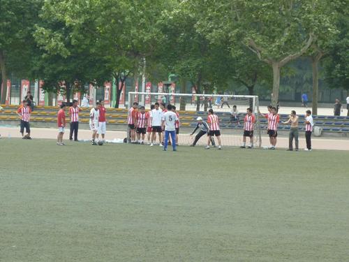 在開球后不長的時間里,兩支球隊在中場展開激烈的爭奪,這時雙方隊員的體力比較充沛,快速的跑動和高頻率的傳球成為這段時間的主旋律。但是不久,2012隊憑借個人技術的優勢和更為有效的控球逐漸掌控了比賽的節奏,形式也對他們更為有利,其中幾位球員的過人與傳球堪稱本次比賽的一大亮點。當比賽進行到上半場的下半段,2012隊的后衛隊員在后場得球后將球迅速傳到本方前鋒10號的腳下,后者依靠速度的優勢接連擺脫多名防守隊員,勁射打門得分,為本場比賽首開紀錄。研2-0832隊也不甘示弱,迅速組織出一次防守反擊,由前鋒單刀直入,扳回一球。在上半場最后階段,2012隊利用一次角球機會,再進一球。上半場結束,2012隊以一球優勢領先。