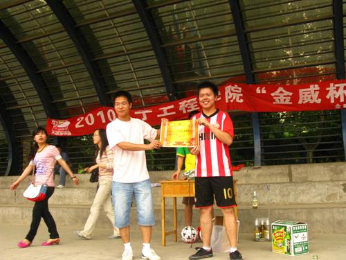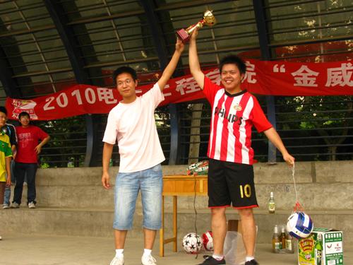 經過短暫的休息,兩支球隊開始了下半時的對抗。2012隊繼續依靠出色的控球掌控著比賽的節奏。雖然研2-0832隊有不少進球的機會,但是2012隊的防守隊員做得更加出色,不斷將危機化解,并打出精妙配合,2012隊在下半場又攻入兩球。隨著主裁的一聲哨響,比分最終定格在四比一。至此,2010電子工程學院“金威”杯研究生足球賽決賽結束,電院2012隊成功問鼎。