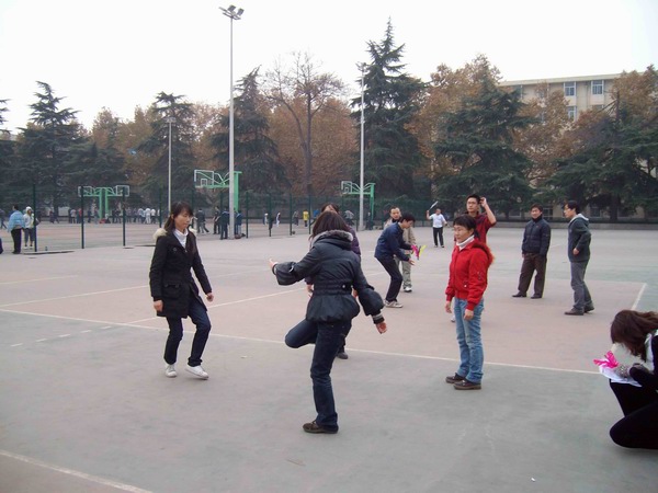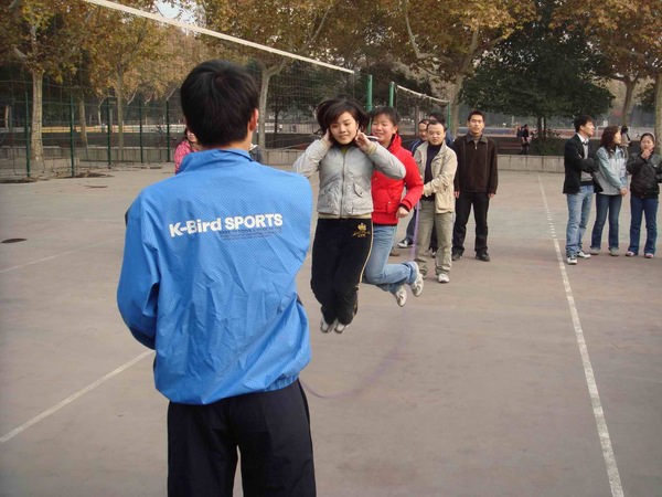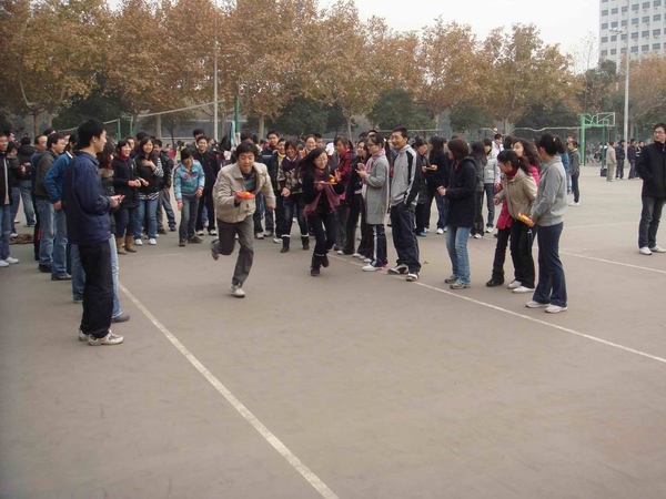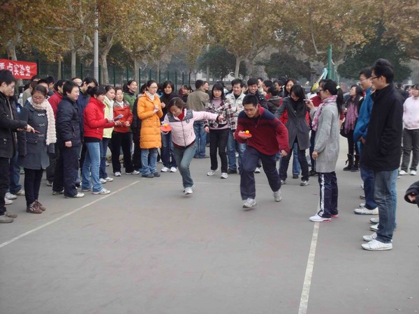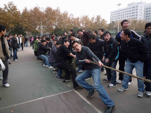 一聲哨響,全場最引人注目的拔河比賽正式開始。在雙方15名男生加5名女生的陣型基礎上,比賽采取三局兩勝制。雙方隊員愈戰愈勇,而拉拉隊員也憋足了力氣喊起口號,各年級種子隊更是齊聚了本年級的大力水手們一展勇力,充分發揮團隊的力量。當拔河比賽進行到半決賽的時候,其他幾個項目也分區域展開。在比賽組織方的周密部署和各項目負責人的通力配合下,各組參賽隊員很多都是男女生搭檔,在突出個人能力的同時更加注重默契和協作。踢毽子和跳繩是女生們最為親睞的項目,平日里在實驗室伏案,專心于學術的智能所學子們,紛紛變得生龍活虎,巾幗不讓須眉。而用球拍帶乒乓球接力的趣味乒乓球賽,和隊員來回傳球的互動排球賽,則是男生們大展身手的時機,大家信步穿梭,驕如龍健如虎。更為有趣的雙人障礙跑,盡管有步伐一致上的障礙,但男女生的默契配合明顯在賽場上顯示了其優勢,你來我往其樂無窮。在其他幾個項目都決出冠亞軍之后,拔河總決賽中,研三隊獨占鰲頭,而研二隊則獲得了第二名。同時,教師代表也同大家進行了一場拔河友誼賽,師生同樂,彼此間的親密更進了一層。