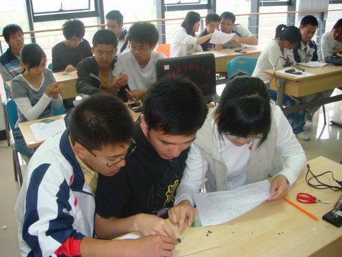 5月10日上午九點,大學生活動中心I-213座無虛席,大一220余名同學冒雨來到大學生活動中心,比賽在簡短的開幕式后正式開始。雖然大一同學對相關知識掌握不是很全面,但大家對此表現出了極大地熱情,有很多同學在比賽宣傳初期就開始學習相關知識和練習焊接技術,在現場表現了較高的水平。在近三個小時的比賽中,大家都一絲不茍,目光中充滿了對知識的渴望。當比賽進行到作品調試階段時,大家都屏氣凝神,調試成功的同學都非常激動,賽場上發出陣陣歡呼聲,很多同學都要求吧圖紙帶走留作紀念。