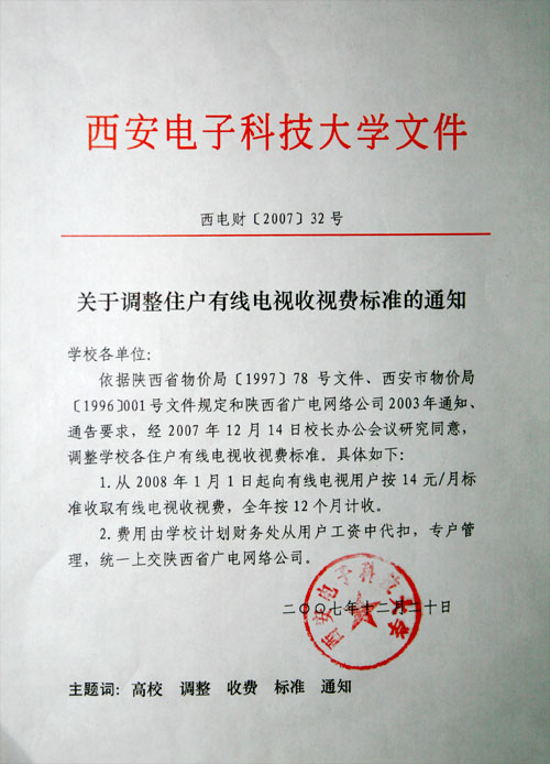 接到上述文件、通告后,學校有關部門采取多種渠道,積極主動地與陜西省廣電網絡公司協調協商,才使得我校有線電視用戶收視費較長時間沒有調整。自2007年以來,廣電網絡公司多次發出通知,堅決要求按照以上文件、通告中的規定及要求收繳電視收視費。為此,經學校校長辦公會議研究決定,自2008年1月1日起調整有線電視用戶收視費,具體收費標準及收繳事宜見學校文件。