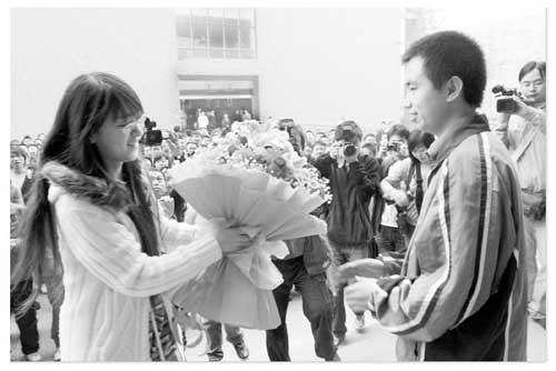 西安電子科技大學的數百同學校園歡送即將起程前往北京捐救命造血干細胞的羅歡,圖為一位學生代表將鮮花獻給愛心大使羅歡(前右)。