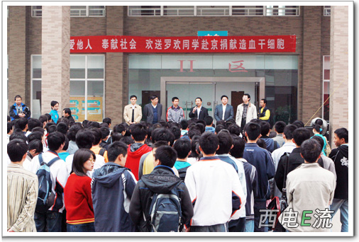 4月11日,在羅歡赴北京接受造血干細胞的提取手術前,我校為羅歡舉行了隆重的歡送儀式。電子工程學院分黨委書記劉應南、副書記鄧卓峰、學生工作處副處長黨文學及部分電院師生參加了歡送儀式。儀式上,與他同班的13名女同學給他獻上了一幅自己親手繪制,名叫《13個女生的心愿》的圖畫。4月12日,羅歡將在父母和中國造血干細胞捐獻者資料庫陜西分庫工作人員陪同下前往北京。