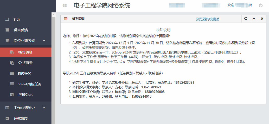 根據工作安排,現已將我院2025年個人業績上傳至學院網站教師系統,為順利完成后續工作,請您及時查看核對,如有問題請在系統中反饋。反饋截止時間:2026年1月16日(周五)17:30。