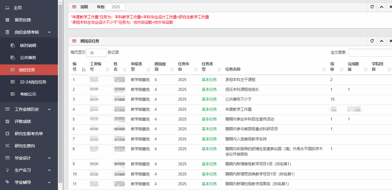 3.“年度教學工作量”顯示為:教學工作量(本科)+研究生+院內畢設+院外畢設+校外畢設。