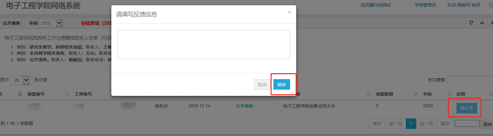 電子工程學院關于核對2020年個人業績的通知 2021-01-11 19:23:00 瀏覽次數: 電子工程學院全體教工: 根據學院聘崗方案,現已將我院2020年個人業績完成情況上傳至學院網站教師系統,為順利完成績效發放工作,請大家及時查看并反饋。反饋截止時間2021年1月13日下午14時。 (具體步驟如下圖所示登錄http://www.bjpacx.com) (反饋內容可在相關條后直接填寫并提交) 責任編輯:鄧鑒 上一篇文章:關于2021年西安電子科技大學教育教學改革研究項目申報的通知 下一篇文章:關于2020年度學院黨員領導干部民主生活會征求意見的通知