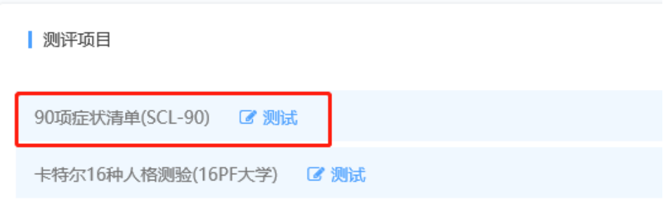點擊“心理測評”圖標后,可看到參與測試的量表“90項癥狀清單”;點擊量表名稱后面的“鉛筆“圖標,即可開始測試,如下圖: