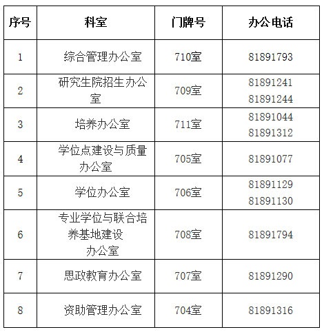 研究生院/研究生工作部關于變更辦公地點的通知 2019-01-07 21:58:00 瀏覽次數: 廣大師生、各單位: 研究生院/研究生工作部自2019年1月7日(星期一)搬至南校區行政樓七樓辦公,請相互轉告。具體辦公地點及辦公電話如下: 上一篇文章:請提前選研究生課程的2019級推免生登陸系統核對選課情況 下一篇文章:關于2018年度研究生校園地國家助學貸款面簽的通知