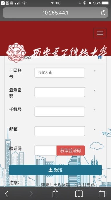 北校區碩士研究生關于無線登錄頁面激活賬號的通知 2017-11-06 16:06:00 瀏覽次數: 全體碩士研究生: 為加強個人賬戶安全管理,暢通溝通渠道,現系統需完善個人常用手機號及郵箱等聯絡方式,請您配合完善后再登陸。激活過程中如有疑問請撥打88201252或88201650 激活方式: 1.筆記本電腦或手機連接stu-wlan,彈出如下圖所示頁面(如果未自動彈出,請在瀏覽器輸入10.255.44.33) 2.輸入用戶名密碼,點擊登錄。彈出如下所示頁面,按提示操作即可 3.彈出如下界面,說明激活成功,激活成功后重新輸入用戶名密碼即可成功登錄。 上一篇文章:關于做好2016~2017學年研究生評優工作的通知 下一篇文章:2017年度天線與微波技術重點實驗室學術年會征稿啟事