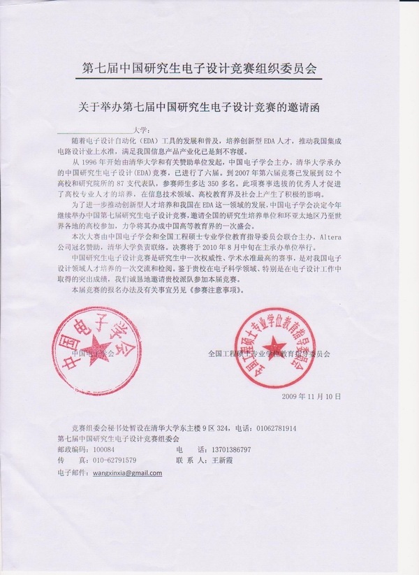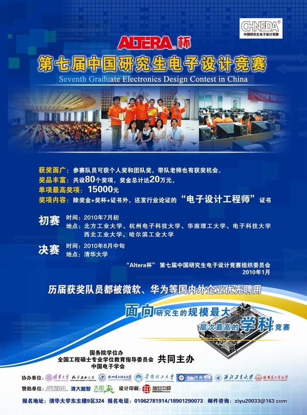 由“國務院學位辦全國工程碩士專業學位教育指導委員會”和“中國電子學會”共同主辦的“2010年第七屆中國研究生電子設計競賽”已經開始報名啦!本次大賽除邀請各高校和科研院所參賽以外,還將邀請中國港澳臺地區及環亞太各國和地區的代表隊參賽,力爭將其舉辦成全球華人乃至世界電子設計人才的一次盛會。本次大賽的比賽規模之大,影響力之深,足能夠成為電子信息領域的一個重大新聞熱點。本次大賽由清華大學負責聯絡,Altera公司冠名贊助。通過本次大賽,選手們不僅能夠學習到EDA的相關知識,接觸到集成電路設計的最前沿思想,而且還能夠獲得豐厚的將品,且獲獎比例大:本次大賽預計將決出40個團體優勝獎,獲獎隊將獲得獎杯1座、及最高達18,000元人民幣的獎金;預計決出40名優勝個人獎,獲獎者將獲得獎牌、獲獎證書,以及最高達5,000元人民幣的獎金;獲得優異成績參賽隊的前20名領隊將獲得優秀指導教師獎金(1000元/人)和主承辦方蓋章的證書。中國電子學會擬向參賽隊員中競賽成績優異的隊員頒發“電子設計工程師證書”及“助理工程師證書”共計280份;競賽組委會向所有隊員頒發國務院學位辦全國工程碩士專業學位教育指導委員會和中國電子學會蓋章的參賽證明。