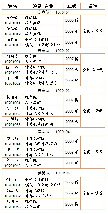 在第六屆全國研究生數學建模競賽中,電院09級博士生何立火參賽隊獲得全國一等獎,08級碩士生簡擁軍參賽隊獲得全國三等獎