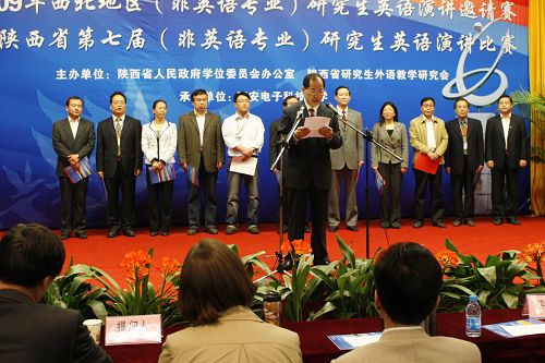 西安電子科技大學校長段寶巖教授、陜西省人民政府學位委員會秘書長孫朝、陜西省人民政府學位委員會辦公室副主任楊俊利、陜西省學位與研究生教育發展中心吳俊剛副主任、甘肅省人民政府學位委員會辦公室侯志峰、西北工業大學研究生院副院長李鐵虎教授、西安交通大學研究生院副院長何茂剛教授、陜西師范大學研究生部主任楊祖培教授和陜西省研究生外語教學研究會會長白靖宇教授、西安電子科技大學研究生院副院長盧朝陽教授等領導出席了本屆演講比賽開幕式。除上述領導外,西安電子科技大學副校長楊銀堂教授和西安建筑科技大學研究生學院常務副院長郝際平教授還出席了閉幕式。