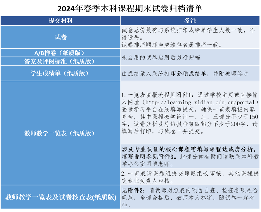 1.以上材料請于本學期提交(7月10日前),紙質版材料交至本科教學辦公室(圖書館B區440室),電子版材料按照“學期(示例:2024春)+課程名稱+任課教師”命名文件夾,發送至dybkjx@xidian.edu.cn。