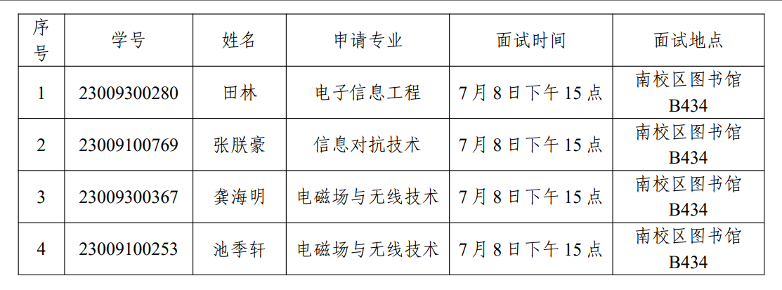 電子工程學院2023級本科生轉專業面試通知 2025-07-07 10:55:00 瀏覽次數: 經學院初審,共4人符合電子工程學院轉專業接收條件,現將轉專業面試時間、地點信息公布如下,請各位轉專業學生按時參加面試,參加面試的學生,請攜帶以下材料各4份: 1.成績單; 2.簡歷; 3.必修課加權平均分、原專業必修課排名證明; 4.在校期間無違紀處分記錄證明。 逾期不到者視為自動放棄。有問題咨詢029-81891663轉205王老師。 電子工程學院 2025年7月7日 責任編輯:王潔 上一篇文章:2022級卓越班第二次分流結果公示 下一篇文章:關于2021~2023級畢德顯班 “遠望谷”獎學金評定結果的公示