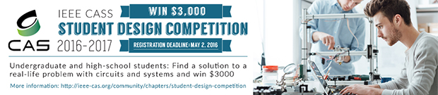 IEEE 電路與系統學會(Circuits and Systems Society,CASS)邀請你參加第一屆IEEE CASS學生設計競賽,該競賽是一個本科生和高中生組隊參與的世界范圍競賽。參賽隊伍的項目應為鼓勵高中學生學習電子工程及相關領域,旨在對現實生活中的問題尋求基于電路與系統的解決方案。