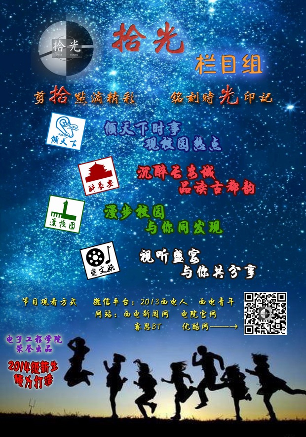 大學時光美好易逝,為與同學們共同度過四年光陰,并記錄下同學們成長的點滴精彩,拾光欄目通過打造特色視頻模塊關注西電動態,點擊時事要聞,記錄美好生活。本欄目由2014級電院新生傾力打造,獨家原創,精致新穎。