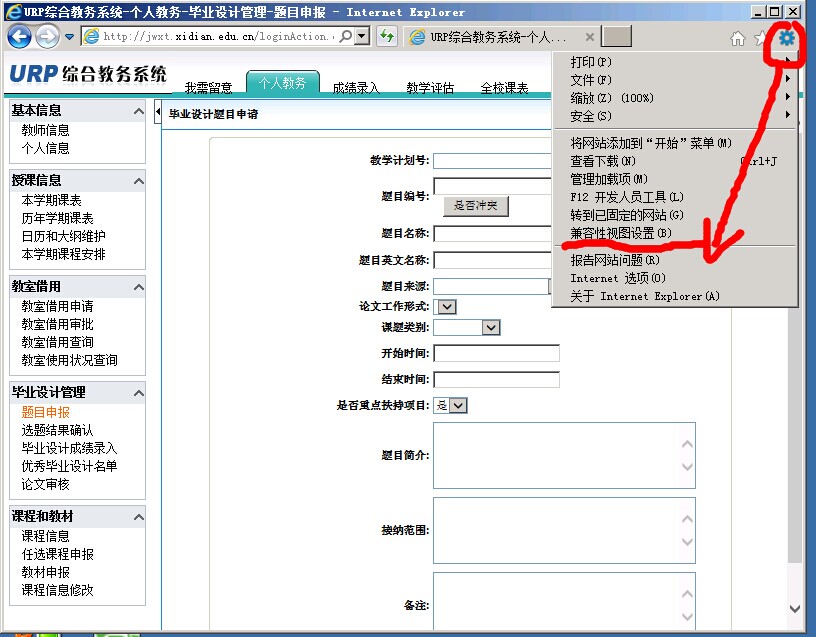近日不少老師反饋,使用2013版本科URP教務系統發布畢業設計題目有各種問題。經過測試發現2013教務系統對瀏覽器的兼容性有一定要求。推薦使用Win7 或者XP上自帶IE8來發布畢業設計題目,如果使用360 遨游等瀏覽器,建議使用它們的兼容模式(2015年11月有老師反饋說 需要用急速模式,不知道是否教務處系統又進行了調整了,請在兩種模式之間切換測試)。Google Chrome 、IE11/10瀏覽器和教務系統存在不兼容情況,無法輸入日期和檢測題目編號沖突,也無法保存題目。下面介紹使用IE 11 /10 和 Google Chrome瀏覽器發布畢業設計題目方法。