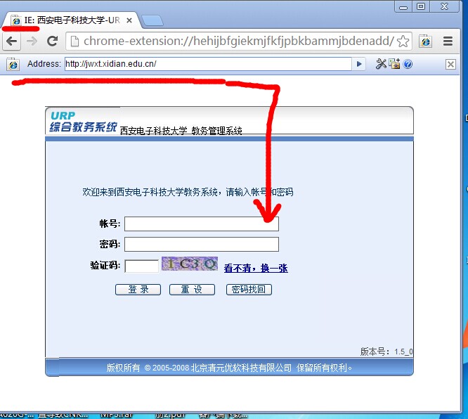 然后用Chrome打開 教務系統,入下圖,點擊右側IE圖標,進入IE兼容模式,登錄系統既可以正常發布畢業設計題目。