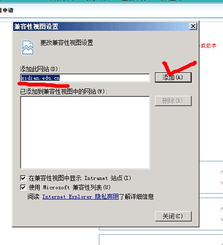 把 xidian.edu.cn域名 加入到 IE11的兼容列表里 然后 添加,關閉退出,如下。
