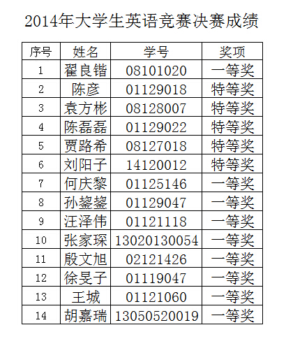 2014年大學生英語競賽決賽成績 2014-06-23 11:21:00 瀏覽次數: 上一篇文章:2014年畢業設計電子論文沒有正確上傳名單2014.6.27 下一篇文章:電院2014年本科畢業設計電子論文提交系統開放-截止6.26