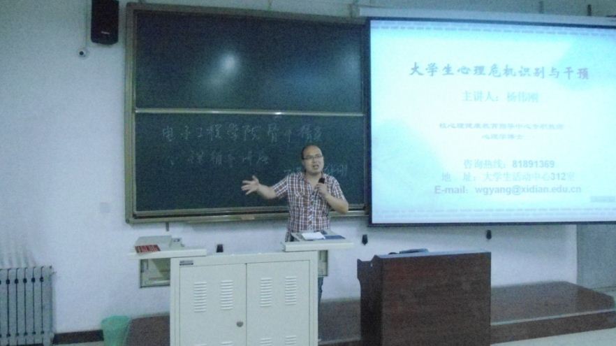 電院宣傳中心訊(通訊員 程海),5月23日晚七點半在B樓211教室,應電院黨委副書記張海戰老師邀請,校心理健康教育指導中心的心理學博士楊偉剛老師為電院各班班干部、宿舍長等骨干精英做了一場主題為“大學生心理危機識別與干預”的心理輔導講座。