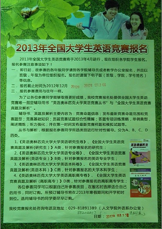 2013年全國大學生英語競賽報名 2012-12-15 15:32:00 瀏覽次數: 上一篇文章:電子工程學院舉行Photoshop基礎知識講座 下一篇文章:西安電子科技大學考點2013年3月全國計算機等級考試報名通知
