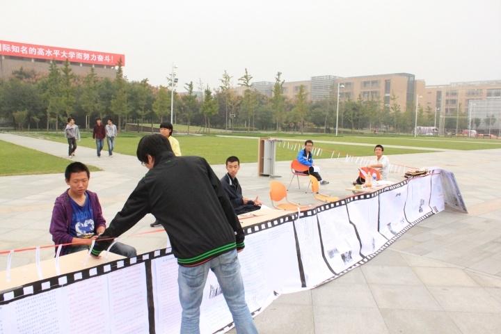 電院團委準備了兩條8米長的白布與30件長T恤以及各種顏料與畫筆,參與活動的同學在白色長布上寫自己想說的話、對母校的祝福、校徽等,也可以在白色T恤上自己設計圖案,他們將優秀作品保留了下來,每一個都合影留念。有的人在白布上寫“西電加油,校慶威武”,有的人寫的話簡單但有內涵“西電萬歲”,有的人設計的T恤衫上的內容也是用圖案畫出了“我愛西電”,所有的一切都將同學們對于母校的祝福大聲喊了出來!西電80周年校慶一定會圓滿成功!