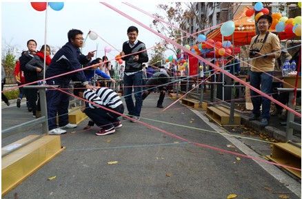 從紅色的拱形門走過,新穎,獨特的各類游戲一一展現在眼前,引得同學們駐足不前,第一個游戲“偷天陷阱”,看到這名字是不是熱血沸騰,瞬間就想起了電影《偷天陷阱》中辛康納利訓練澤塔瓊斯過紅外線的情景?沒錯,今天就讓你在現實中體驗一把。交錯復雜的絲帶上綁了不少鈴鐺,輕輕觸碰便“鈴鈴”作響。只見同學們小心翼翼穿梭其中,看,那位仁兄,整個人趴在地上匍匐前進,一寸寸地移向終點,真是給力啊!哇!那位美女后仰著身子險險地躲過了一根絲帶的阻攔,真是刺激啊!