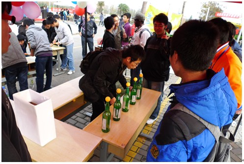 拍拍加速跳動的心臟,再向前走,只見一群同志拿著一把筷子不停地向場地中間的空酒瓶里投擲,這是在干嘛呢?再走近些,不禁被吸引注了,一根根筷子如同離弦之箭,直直地沖向酒瓶口,可不少就只是敲擊過瓶身后“當”地一聲落地,有的甚至是在瓶口華麗的轉過一圈后,遺憾的落地,這時,一根白竹筷如黑馬般廝殺而出,突入重地,它近了,又近了,哇,投進了,人群中爆發出熱烈的掌聲,不幸的是,筆者牛刀小試的十五根竹筷統統壯烈犧牲了,想來,這個名為“扔竹竿”的游戲是極需要智商和運氣的“高端產物”。