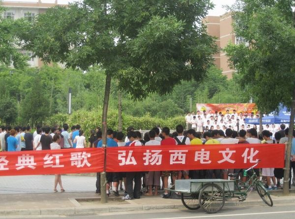 電院宣傳中心訊(通訊員 雷文強)2011年6月14日下午三時許,由西安電子科技大學電子工程學院團委主辦的校園紅歌賽在竹園餐廳東門口順利進行,團委書記孔東老師等作為評委出席了此次比賽,電院各班參加了比賽。