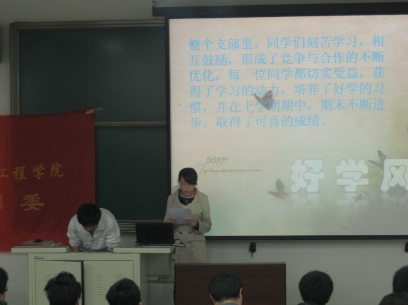 電院“五四紅旗團支部”答辯每年舉行一次,既有對上一年表現優秀的團支部的表揚,又有對所有團支部的鼓勵。本次答辯中,各答辯同學回顧了他們支部組織的活動、幫助同學的事例以及支部同學取得的優異成績,這充分體現出了團支部的活力以及它在大學里的重要地位。答辯過程中,電院團委書記孔東老師等評委對答辯選手進行了提問。盡管答辯同學的語言可能并不是十分完美,卻也言必有中,博得了同學們的陣陣掌聲。答辯接近尾聲之時孔東老師表達了對同學們的勸誡與殷切希望。