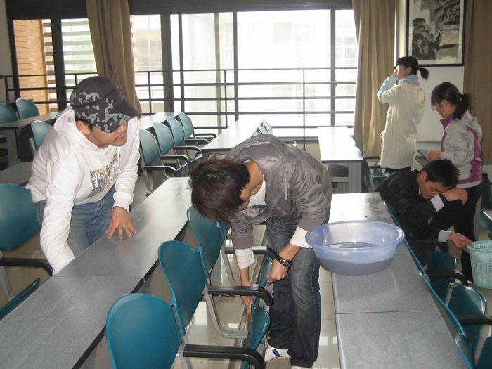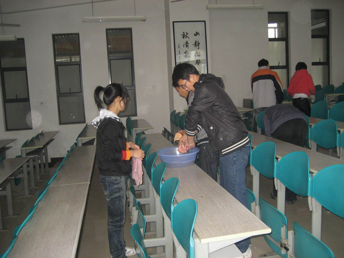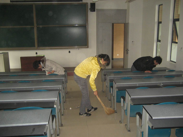 同學們干起活來都相當投入。誰說90后不會干家務,不能干家務?他們拿起掃帚抹布來都有模有樣額。同學們分工也很細致,他們分成一個個小組,一組打掃一個教室。不一會兒工作就結束了。