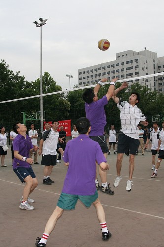 E流網訊(通訊員 段明)2009年教職工排球比賽6月9日下午5時,在學校北校區排球場開幕。連日來,各分會代表隊整齊著裝,神采奕奕,斗志昂揚。賽場上熱氣騰騰,揮汗如雨,比賽異常精彩、激烈。觀眾的吶喊聲、歡呼聲此起彼伏連連不斷。