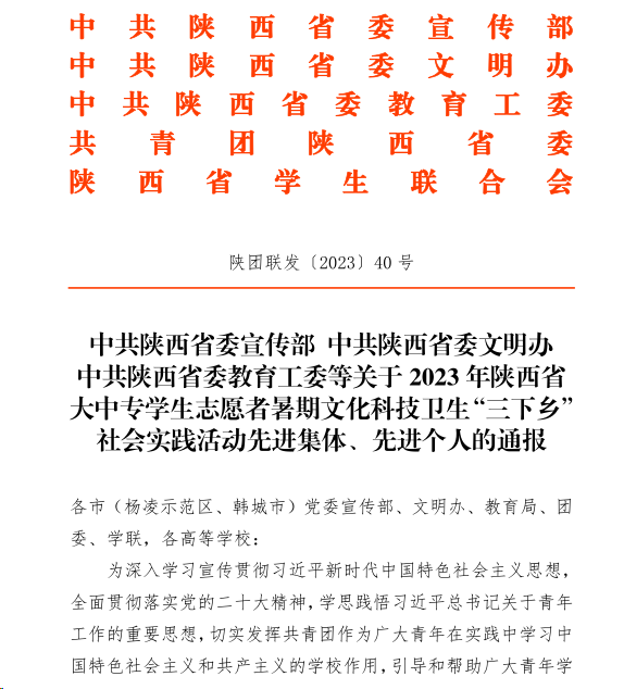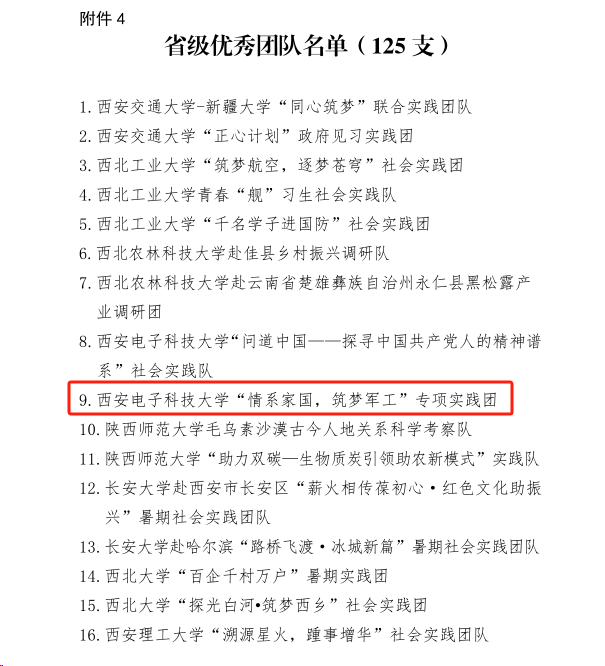 (通訊員畢力格 楊笑宇)近日,由省委宣傳部、省委文明辦、省教工委、團省委、省學聯等單位組織的 2023 年陜西省大中專學生志愿者暑期文化科技衛生“三下鄉”社會實踐活動先進集體評選結果揭曉,電子工程學院“情系家國,筑夢軍工”專項實踐團獲得省級優秀團隊榮譽稱號。