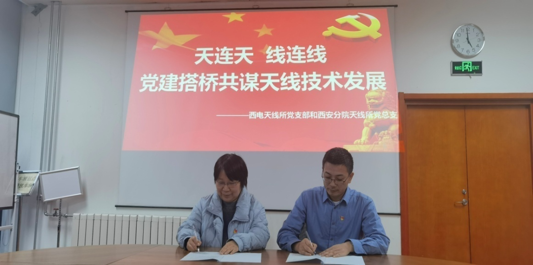 座談結束后,西電天線所黨支部和西安分院天線所黨總支舉行了結對共建簽約儀式,西電天線所黨支部書記劉英和西安分院黨總支書記萬繼響分別代表各自黨組織簽署了共建協議。