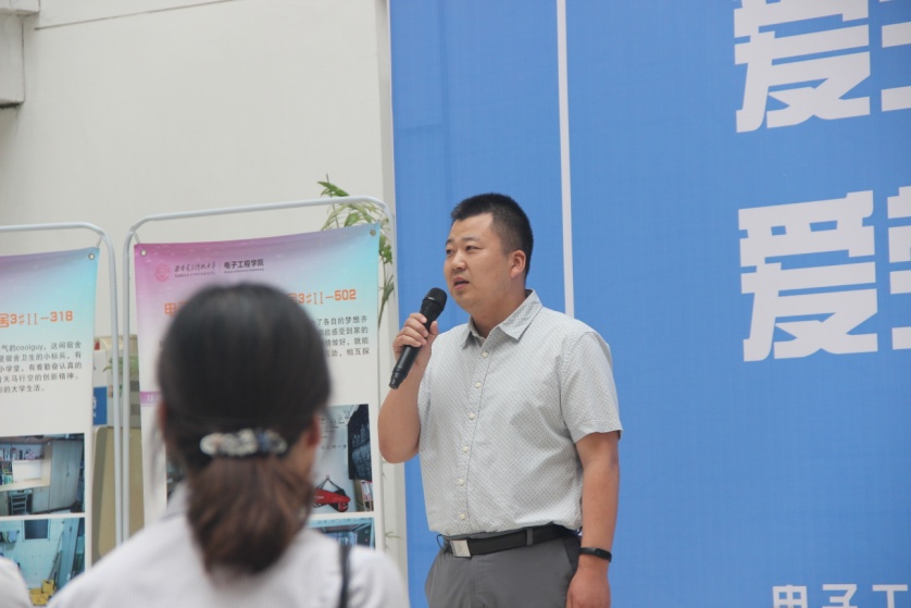 開幕儀式第一項,由電子工程學院黨委副書記劉建鋒進行講話。劉建鋒老師首先為同學們講解了活動的意義并肯定了同學們在文明宿舍創建活動中所付出的努力;隨后通過講述親身經歷及感悟希望同學們切實認識到創建良好安全宿舍環境及體悟勞動精神的重要性;最后希望所有同學提升自我,成為榜樣,以點帶面,持續進步,能夠德智體美勞全面發展。