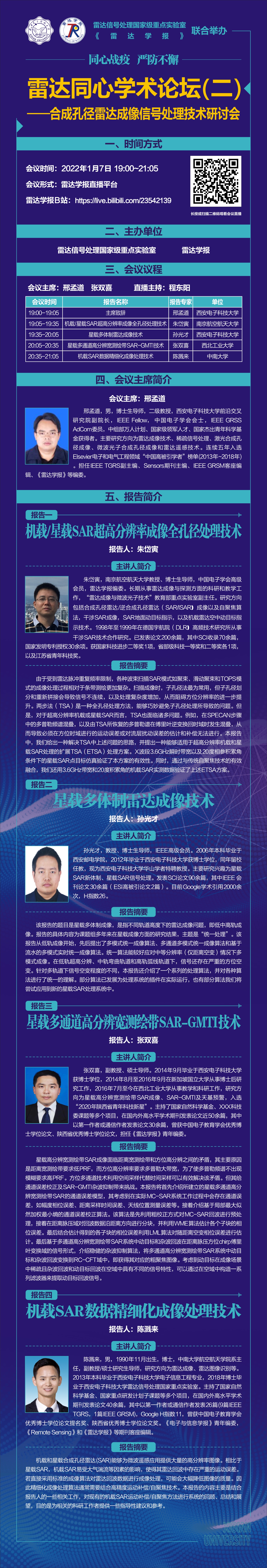 “同心戰疫,云上學術”,為保障廣大學子“停課不停學”、及時學習雷達領域科技知識、了解前沿發展動態,西安電子科技大學雷達信號處理國家級重點實驗室、雷達學報于2022年1月5日開始在線上聯合主辦“雷達同心學術論壇”系列學術研討會。第二場論壇“雷達同心學術論壇——合成孔徑雷達成像信號處理技術研討會”將于1月7日在線上舉辦。