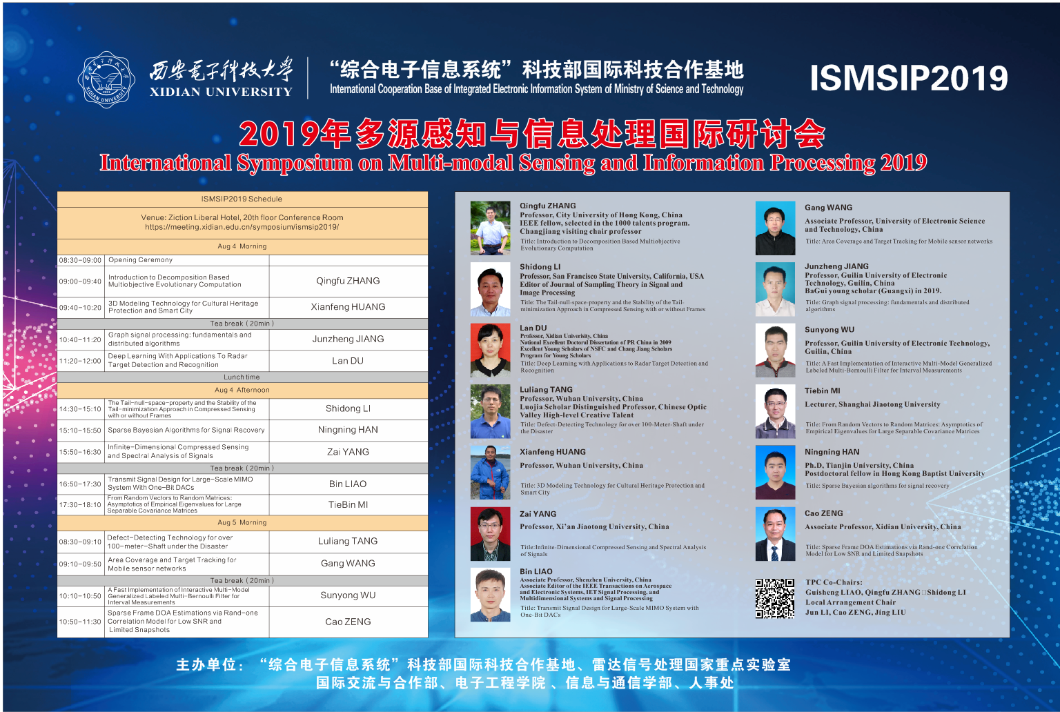 “綜合電子信息系統”科技部國際科技合作基地首屆國際學術研討會(International Symposium on Multi-modal Sensing and Information Processing, ISMSIP 2019)定于8月4 - 5日在西安志誠麗柏酒店20樓會議室舉行。大會邀請到來自美國和英國著名高校的IEEE Fellow等多位相關領域知名專家學者做特邀報告。