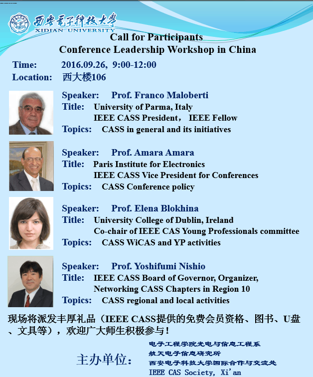 IEEE CASS學術研討會 2016-09-25 18:11:00 瀏覽次數: 講座名稱:Call for Participants Conference Leadership Workshop in China 講座時間:2016.9.26,9:00-12:00 講座地點:西大樓I-106 上一篇文章:新南威爾士大學學者賈秀萍來訪 下一篇文章:瑞典隆德大學劉本健教授來校開展學術交流