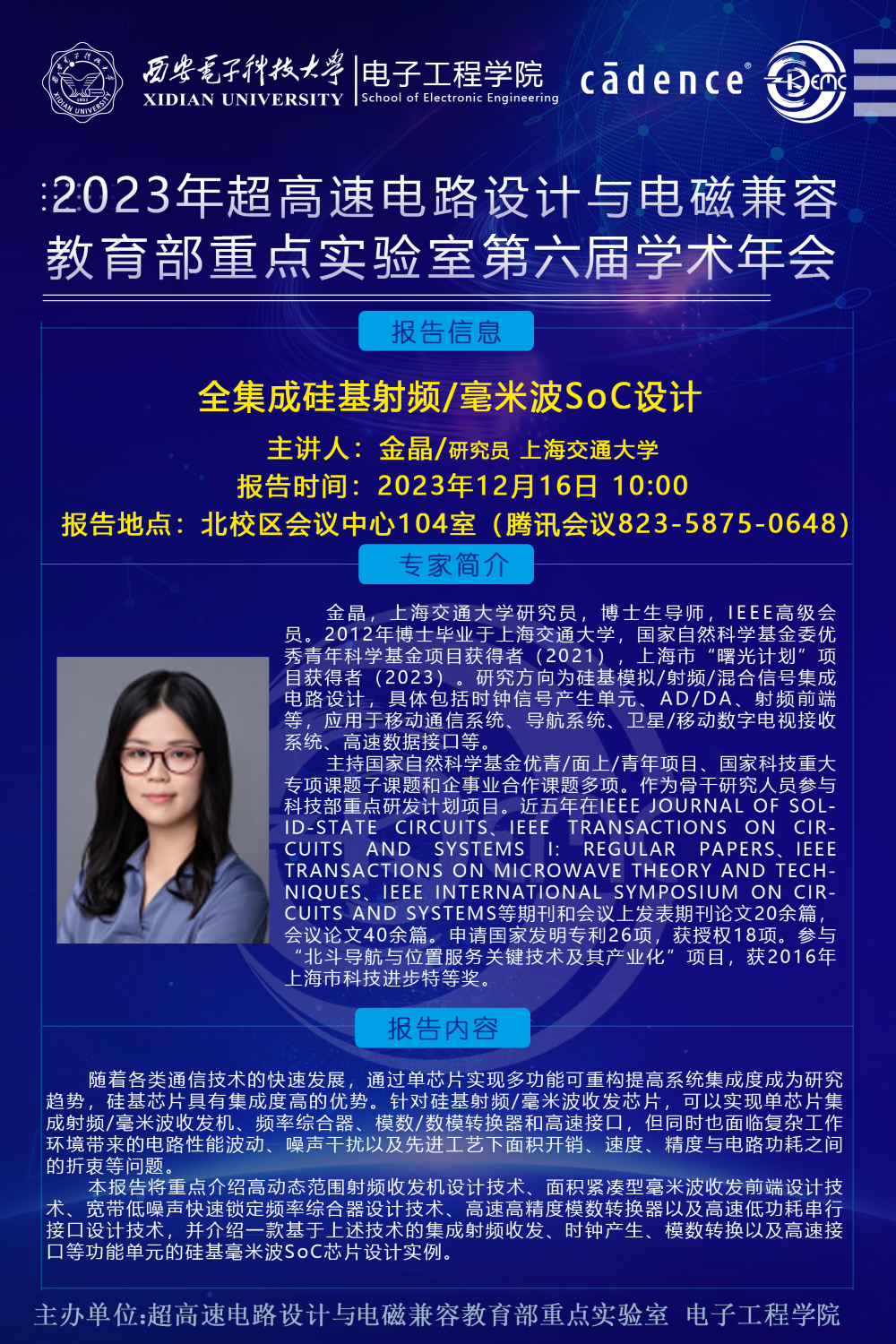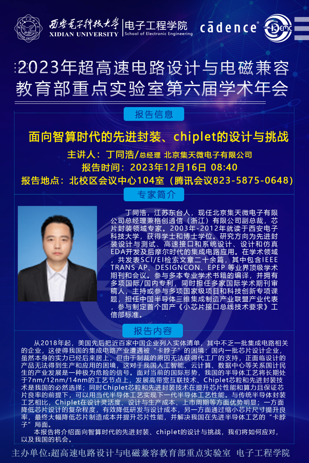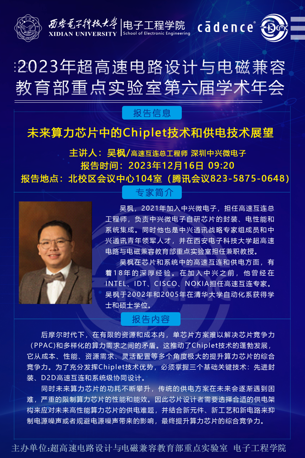 超高速電路設計與電磁兼容教育部重點實驗室第六屆學術年會將于12月16-17日在北校區會議中心104室舉行,騰訊會議(82358750648)線上同步進行。會議邀請了上海交通大學金晶研究員、浙江大學張嶺研究員、北京集天微電子丁同浩、深圳中興微電子高速互連總工程師吳楓、Cadence 系統仿真事業部資深產品經理吳磊等五位相關領域知名專家學者做特邀報告,以及8位優秀青年學者做相關課題匯報交流,還有14位優秀學生論文匯報。歡迎廣大科研工作者入會交流。